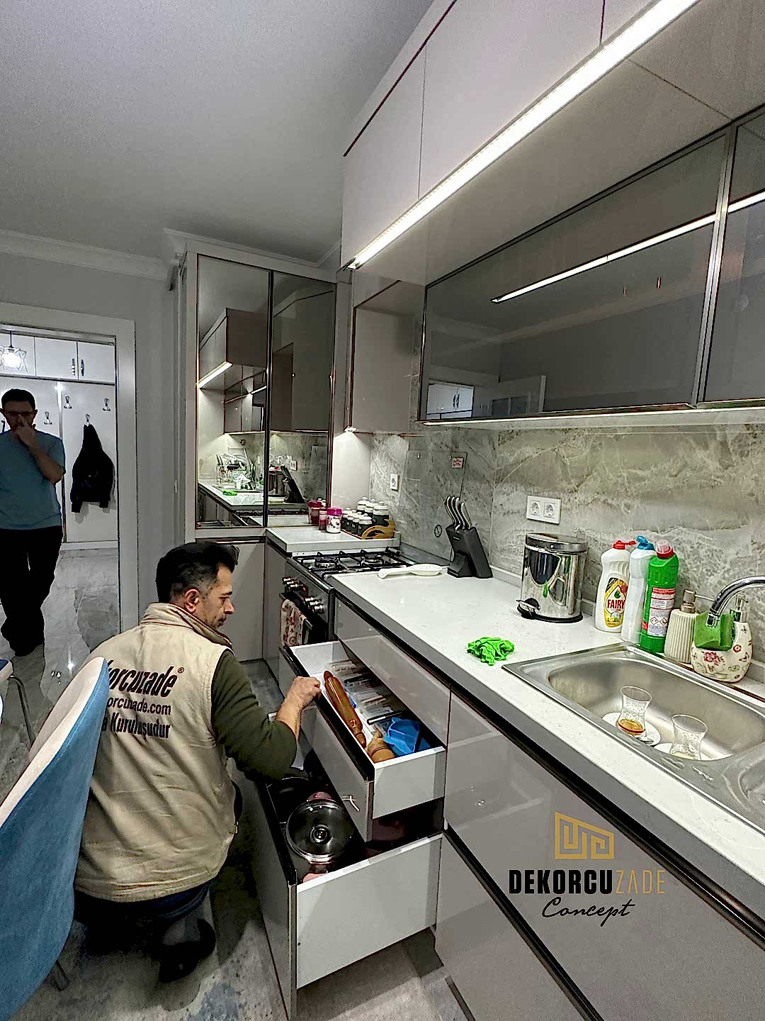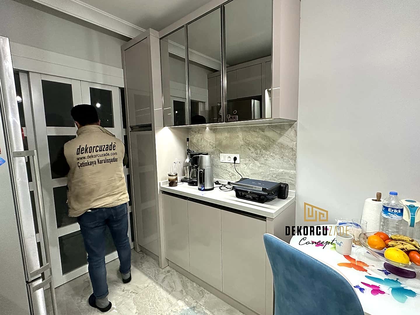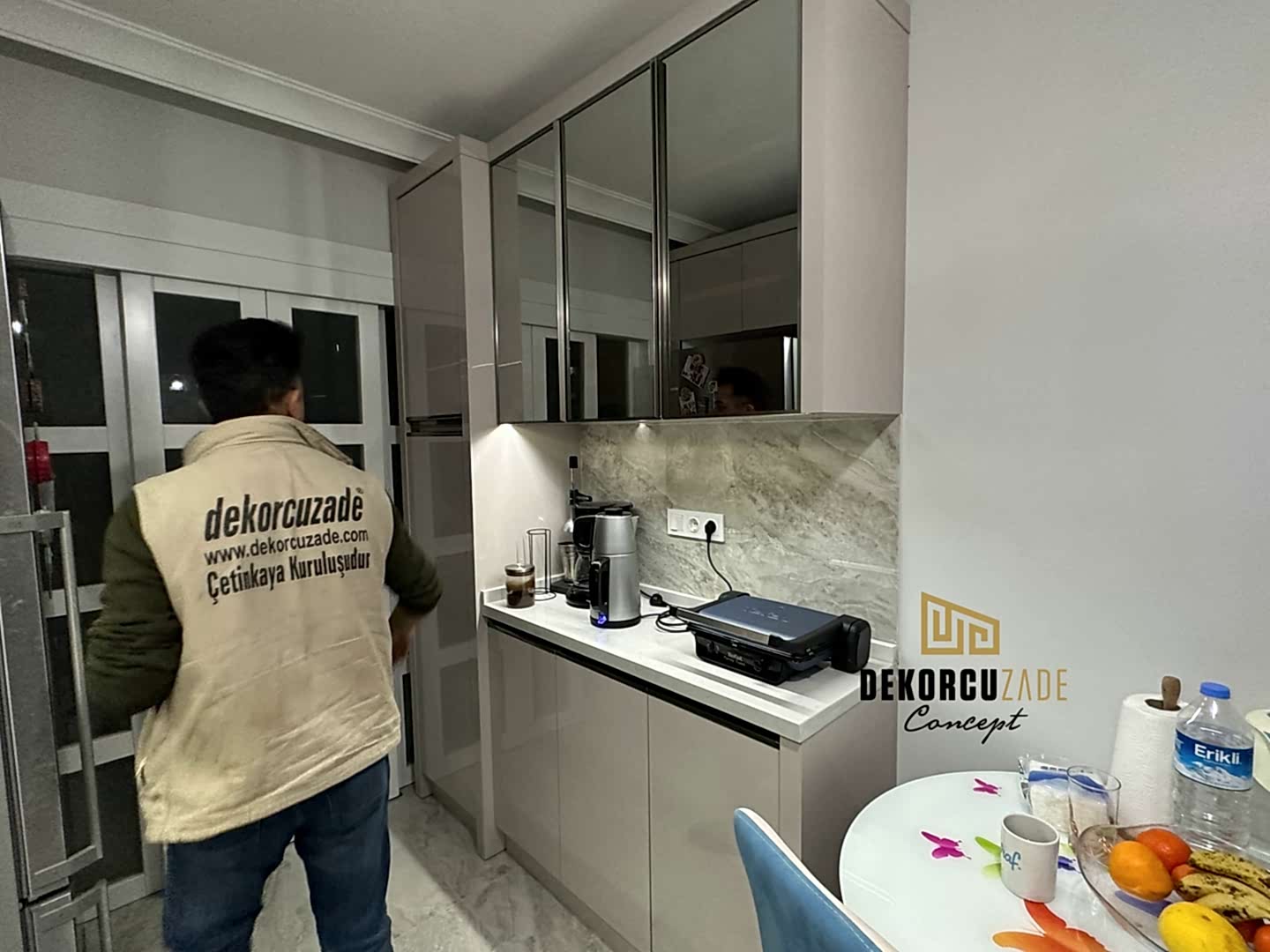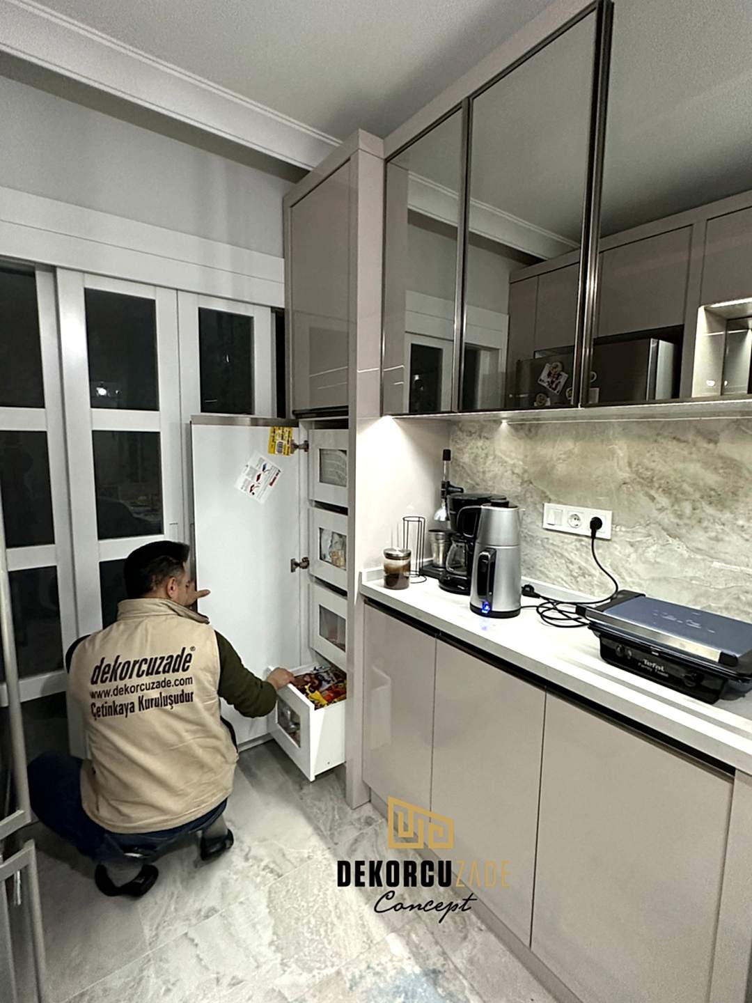 Firmamız, mutfak dolabını takıp gitmekle kalmaz; sizlere anahtar teslim dekorasyon hizmeti sunar. Tüm mobilyalar Siteler’de bulunan DekorcuZade fabrikalarında üretilir ve tadilat ekibi, DekorcuZade Mimarlığın kendi maaşlı personelidir. Dekorcuzade, sokaktan usta toplamaz ve hiçbir dalda aracı olmadan çalışan, tüm personelini kendi bünyesinde barındıran Türkiye’nin tek dekorasyon ve mutfak dolabı firmasıdır.